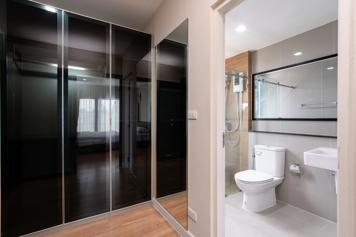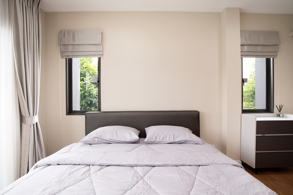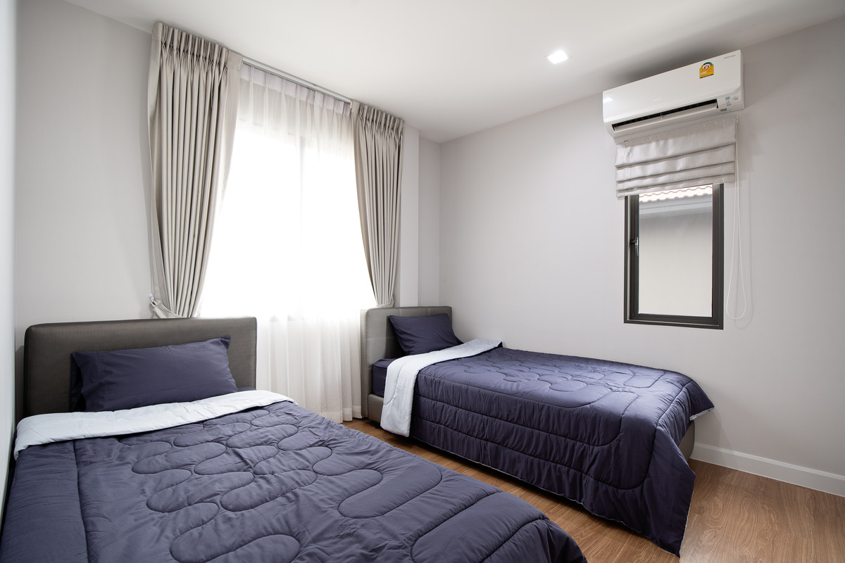 * ห้องนอนพร้อมเตียงและตู้เสื้อผ้า